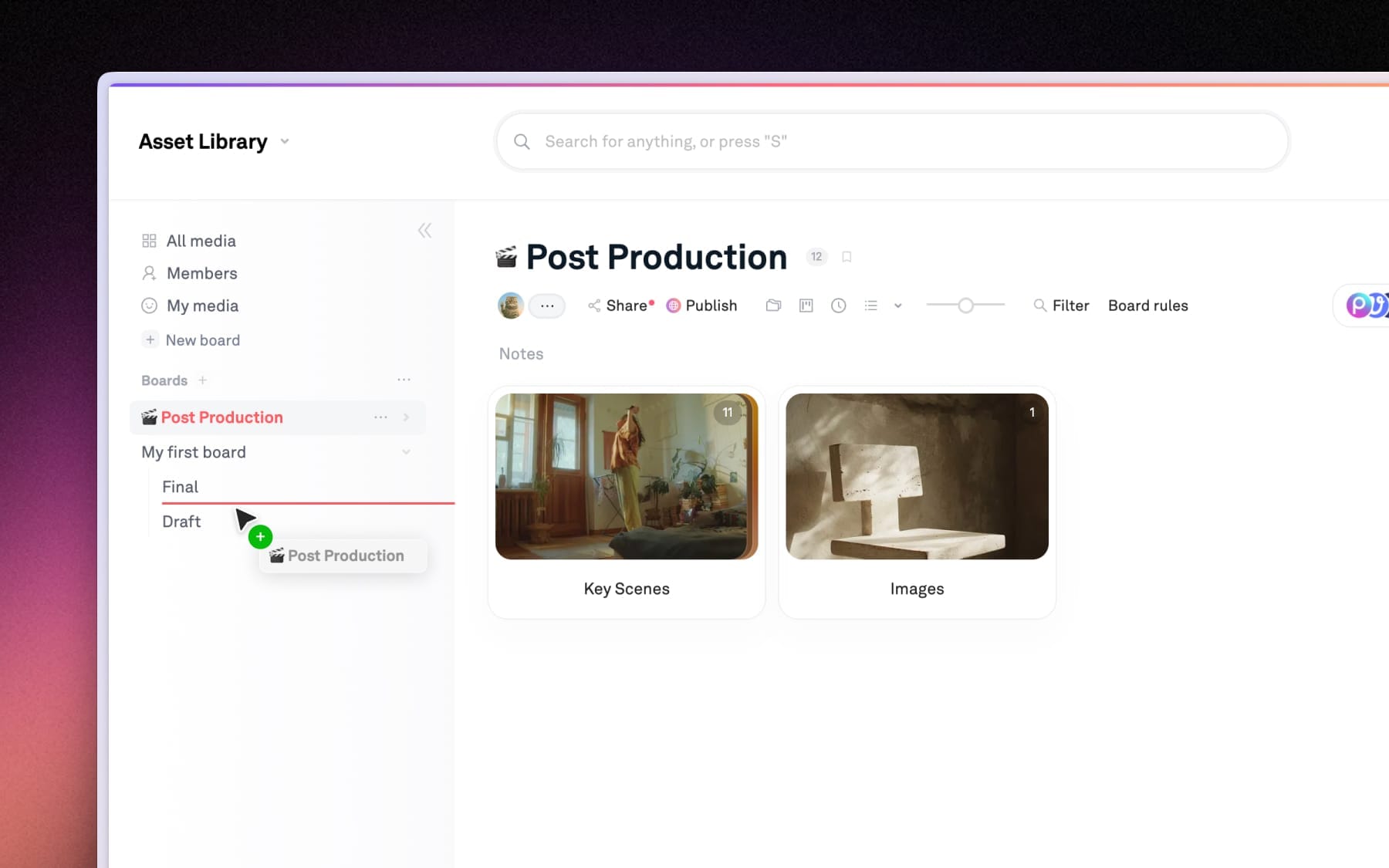 Use boards/collections to create a “Trusted Library” space and a separate “Workbench” space so WIPs don’t get mistaken for final deliverables.