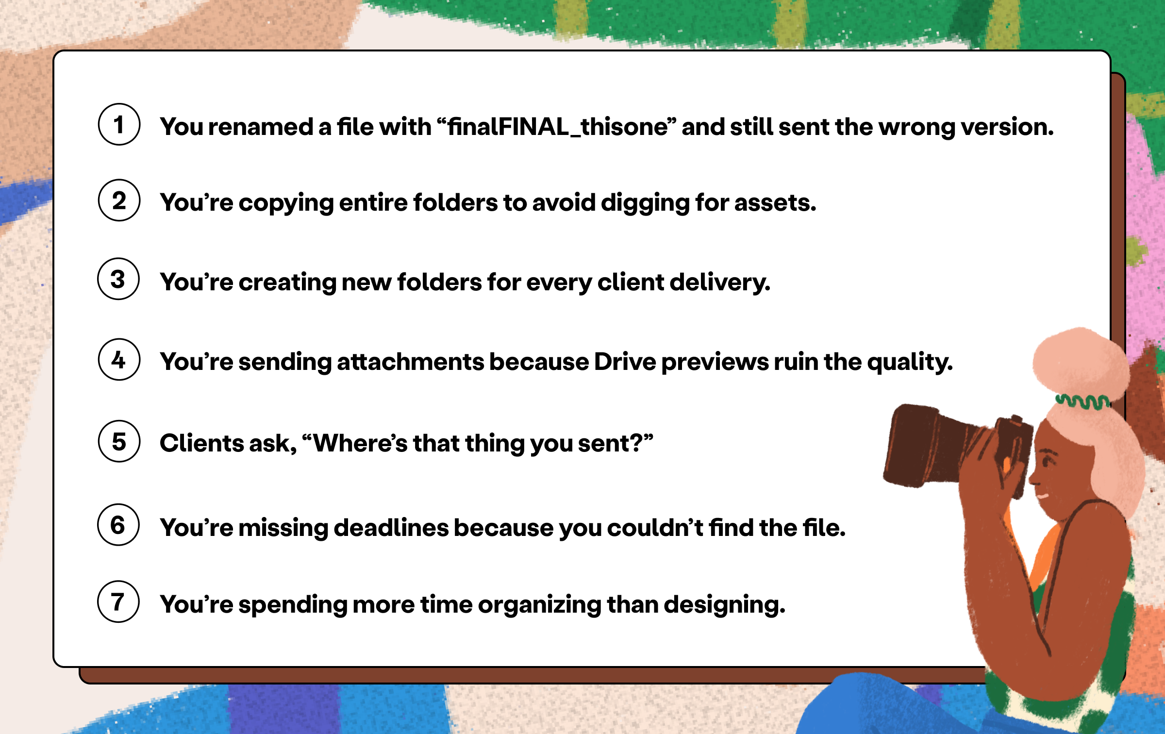 Scattered folders and shared links that look the same create confusion. When clients can't find what they need, they circle back to you, slowing down your momentum and adding unnecessary back-and-forth to every project.