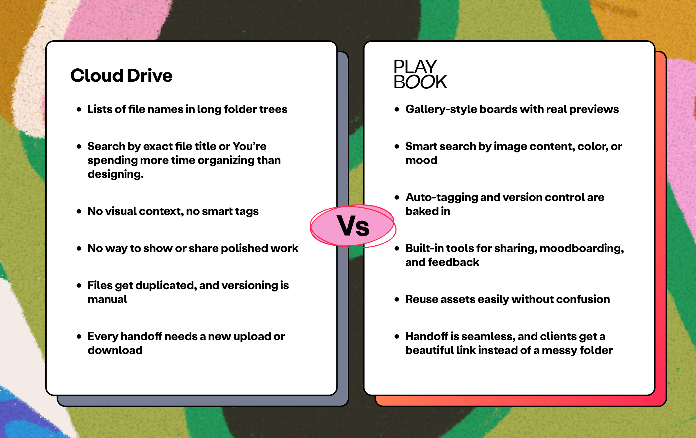 Playbook provides freelancers with the tools to stay organized, move faster, and present their work professionally without the limitations of traditional storage. Whether you're handing off files, pitching new ideas, or updating your portfolio, it brings order to the creative process so you can focus on what you do best.