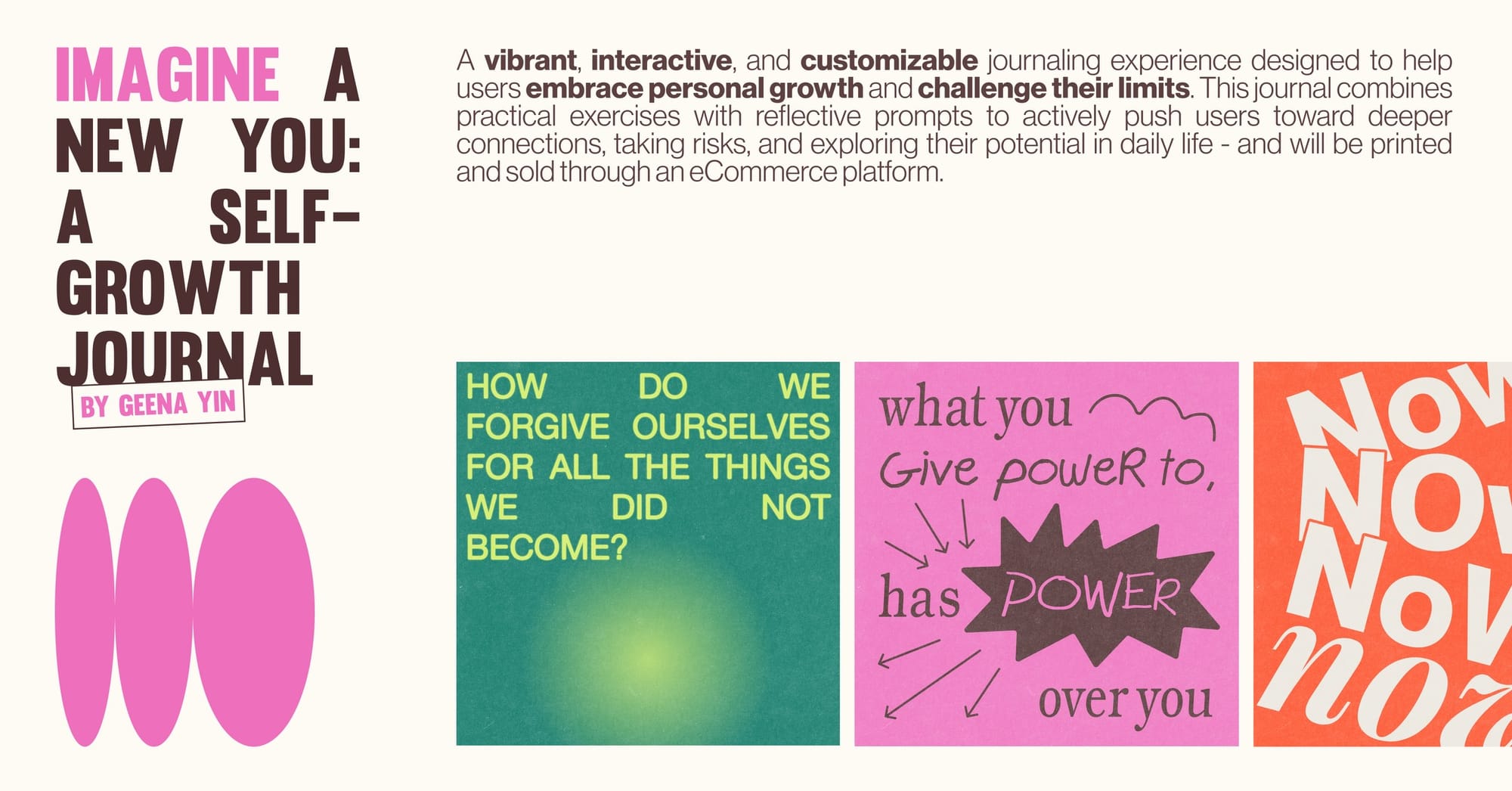 Geena’s project is a personalized journal that transforms traditional journaling through interactive prompts, bold designs, and customizable features. Her goal is to offer a more meaningful and practical alternative to conventional blank or overly structured formats.