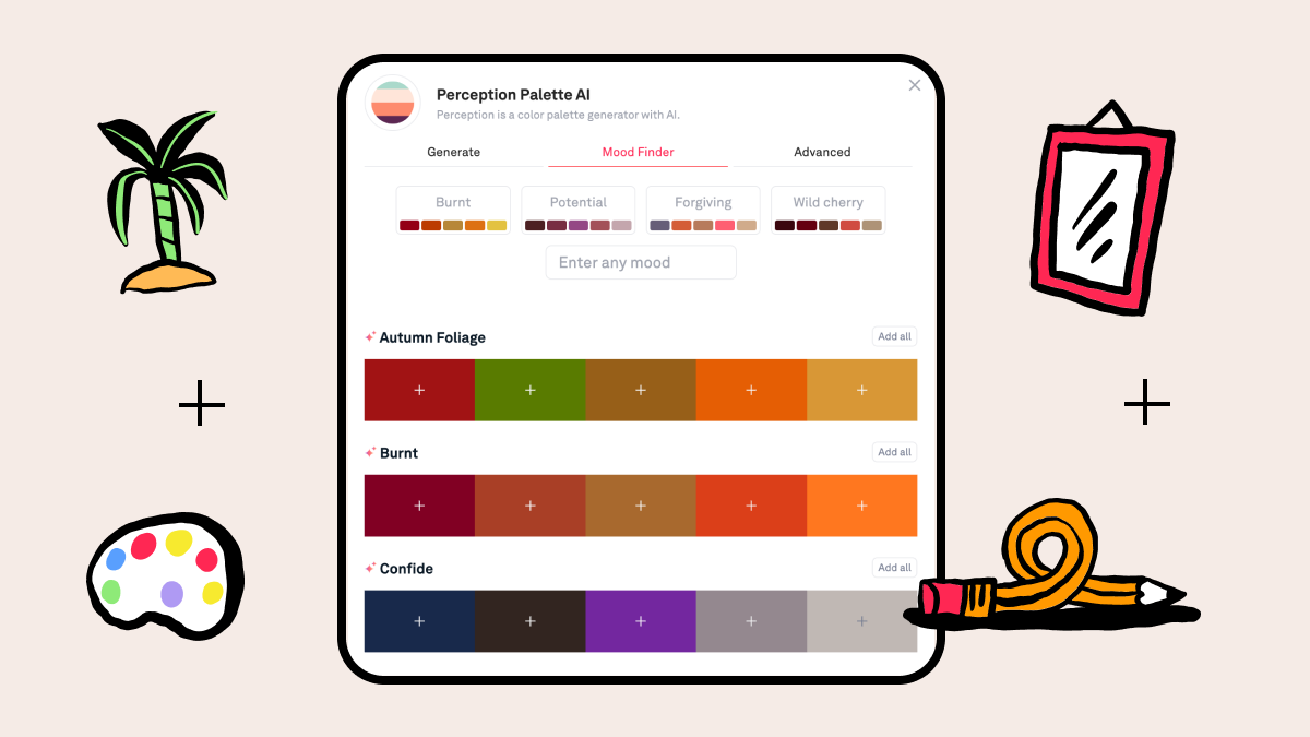 Based on color theory and powered by AI, simply enter a prompt or upload a photo or moodboard, sit back, and let Perception build sophisticated, professional color palettes in seconds.
