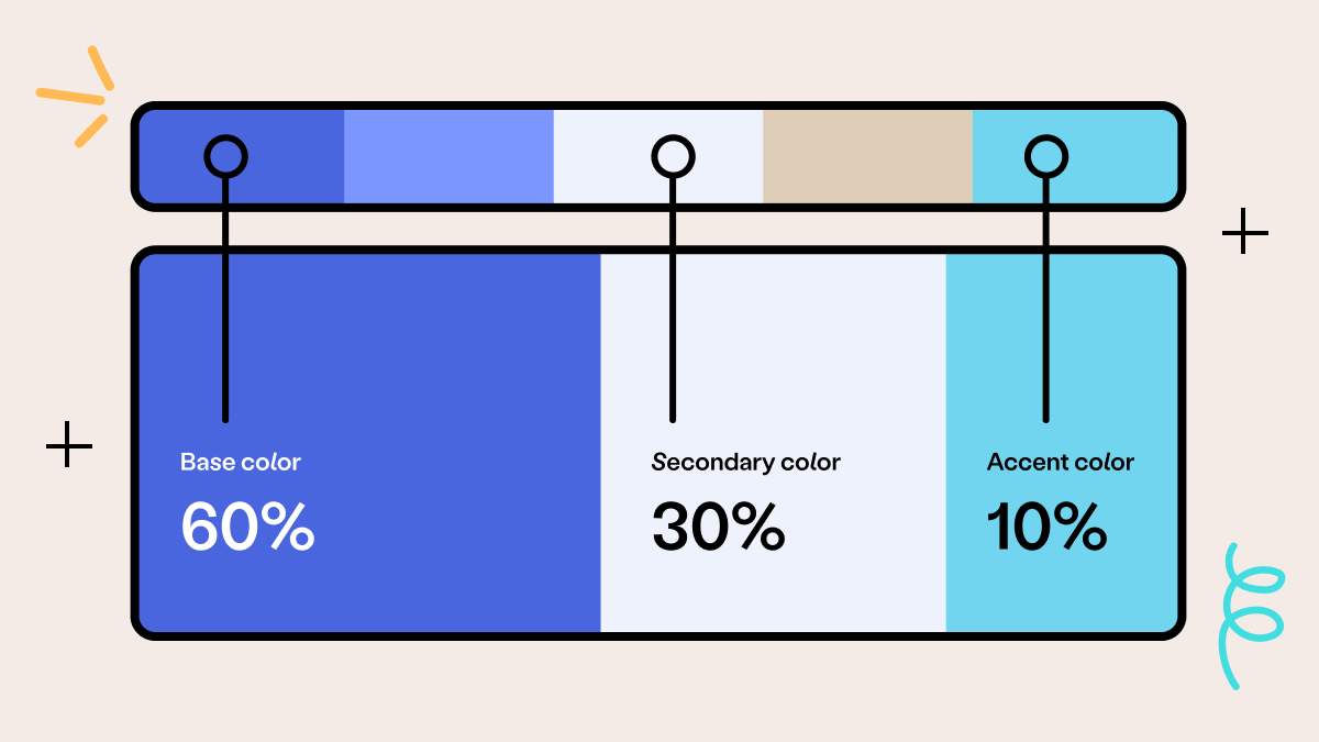 Once you’ve selected your base color, you can move onto curating the rest of your color palette. Follow the 60-30-10 rule when curating your color palette, which says that, after your 60% base color, 30% of your color palette is made up of your secondary shade, while 10% is used for accent colors. Even if your palette has more than three shades, following this guide will allow you to keep things in balance for your viewers.