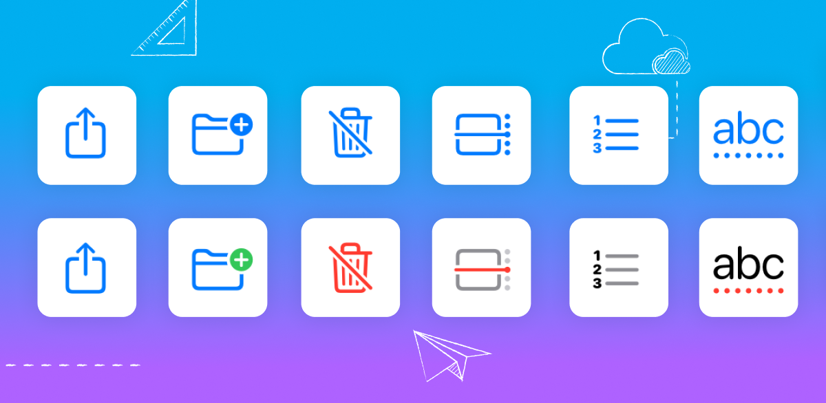 • Consistency: All icons in a set should maintain the same style, including visual weight, stroke thickness, size, corner radius, shape, and fill to create a cohesive visual language.