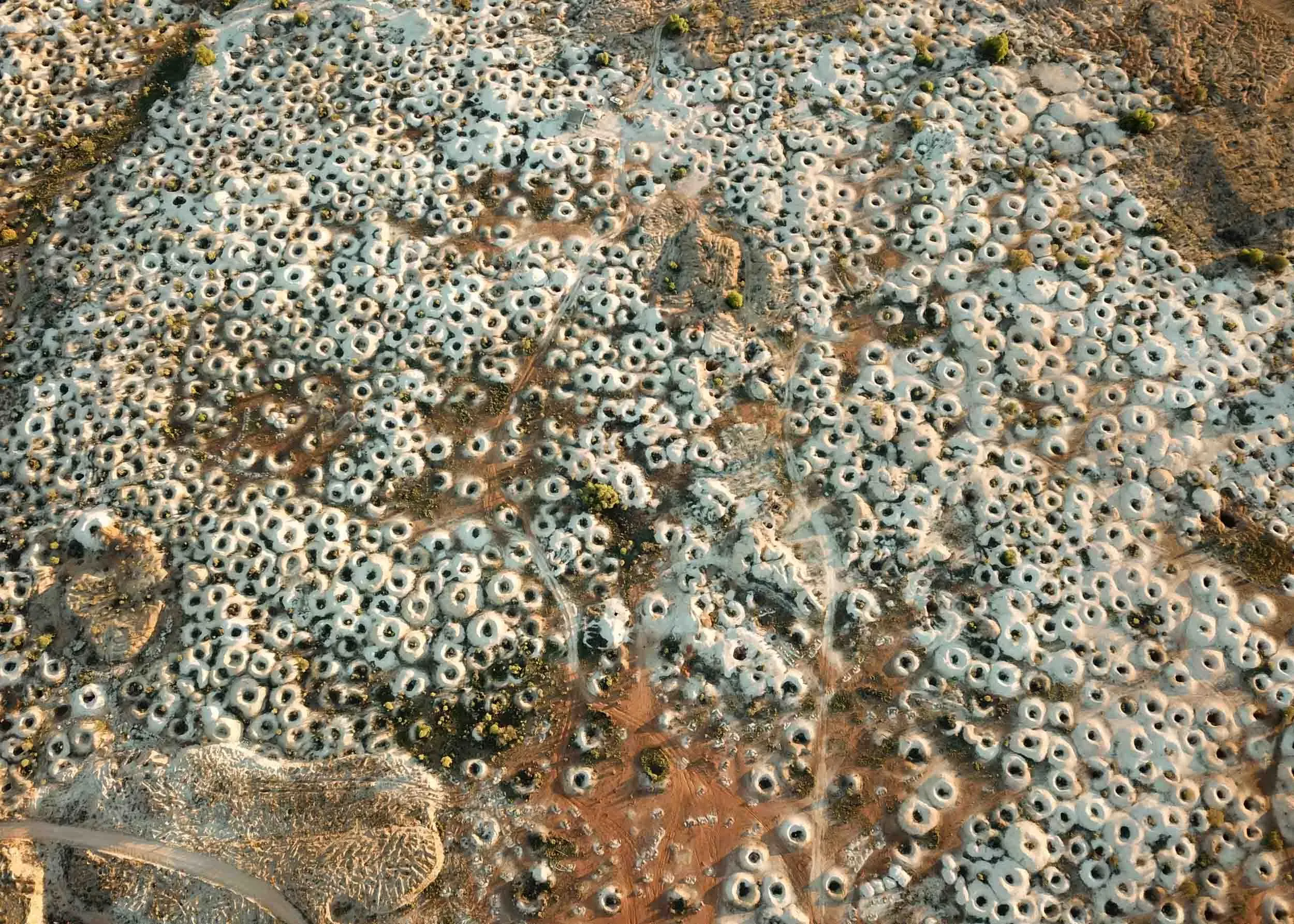 “An aerial view of the area reveals a moonscape-like terrain, shaped by an estimated 50,000 opal mine shafts.”
