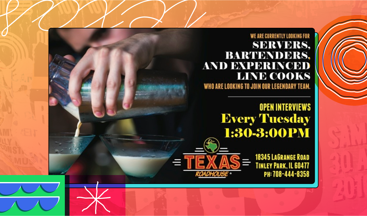 In the example below, the key message (“We are looking for staff”) is confused by the inconsistent spacing and right-alignment. It would be better on the left and in a consistent, readable font.
