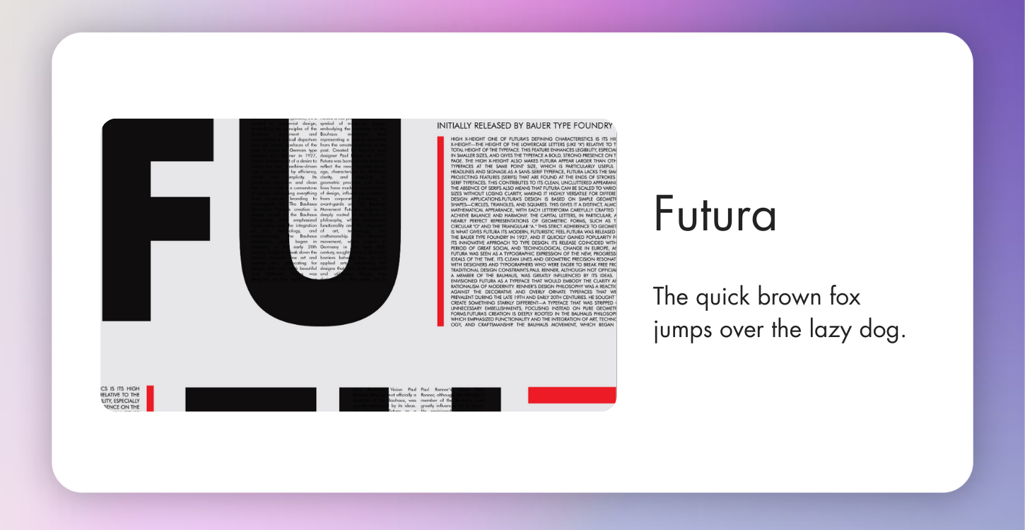 Designed in 1927 by Paul Renner, Futura is geometric, modern, and timeless. Its simple shapes give your portfolio a forward-thinking feel without overwhelming the work itself.