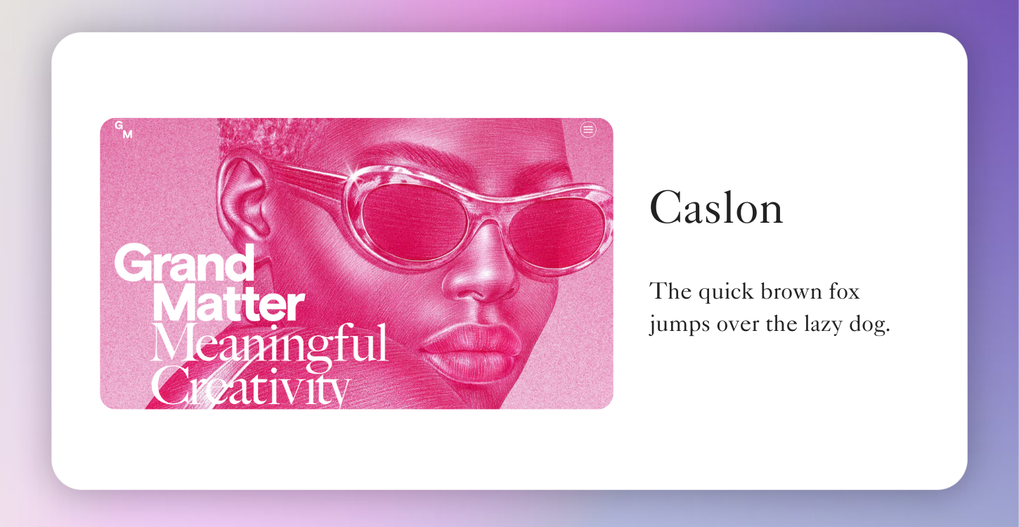 A timeless serif designed by William Caslon in the 18th century, Caslon remains popular in both digital and print. It communicates reliability and tradition while staying warm and approachable.